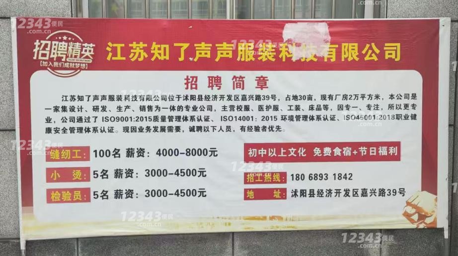 缝纫工100名工资4000-8000元、小烫5名工资:3000-4500元、检验员5名,工资3000-4500元 初中文化,免费食宿+节日福利 招工热线:18068***842