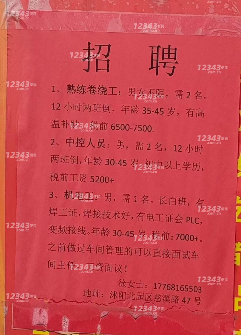 男女不限,需2名。12小时两班倒,年龄35-45岁,有高温补贴,税前6500-7500.