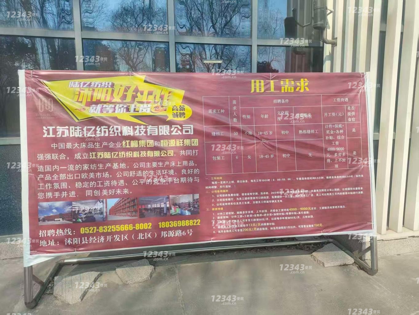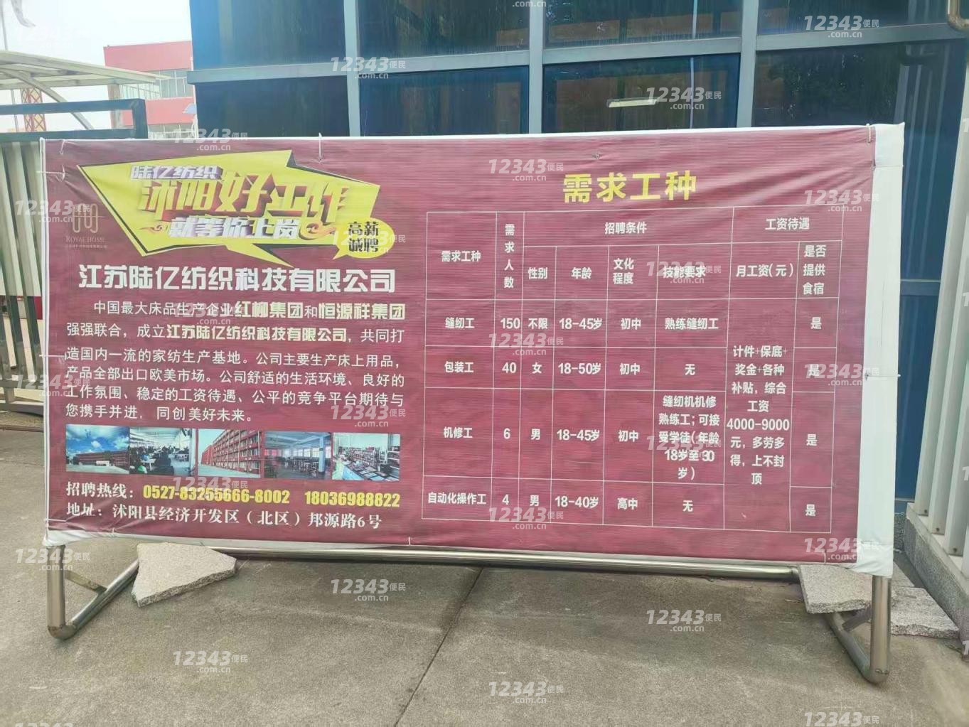 江苏陆亿纺织科技有限公司招聘缝纫工、折叠工、包装工、打箱工、机修工等,工资:计件+保底+奖金+各种补贴,综合工资:3500-9000元(多劳多得,上不封顶),年龄:18-45岁,初中学历!欢迎广大求职者报名,联系电话:1803***8822