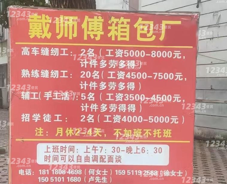 熟练缝纫工:20名(工资4500-7500元,计件多劳多得)辅工(手工活): 5名(工资3500-4500元,计件多劳得得)招学徒工: 2名(工资4000-5000元)注:月休2-4天,不加班不托班