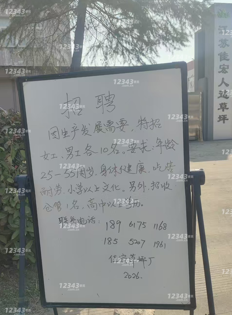 招聘因生产发展需要,特招女、男工各10名。要求:争龄25-55周岁.身体健康,吃苦耐劳.小学以上文化。另外,招收仓管1名,高中以上学历.联系电话:1896175116818552071961佳宏草坪厂