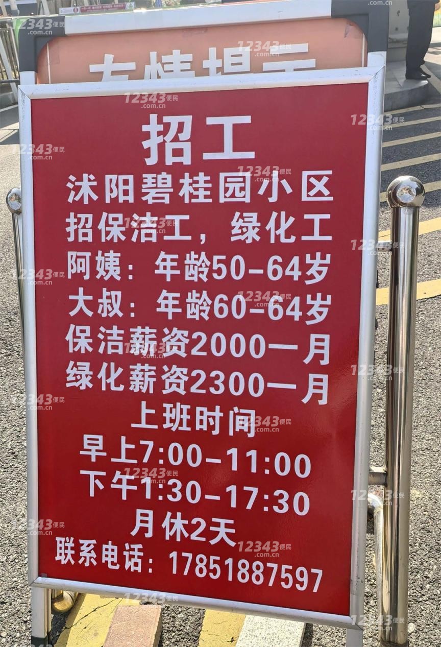 保洁工,绿化工阿姨:年龄50-64岁大叔:年龄60-64岁保洁薪资2000一月绿化薪资2300一月上班时间早上7:00-11:00下午1:30-17:30月休2天联系电话:178****7597